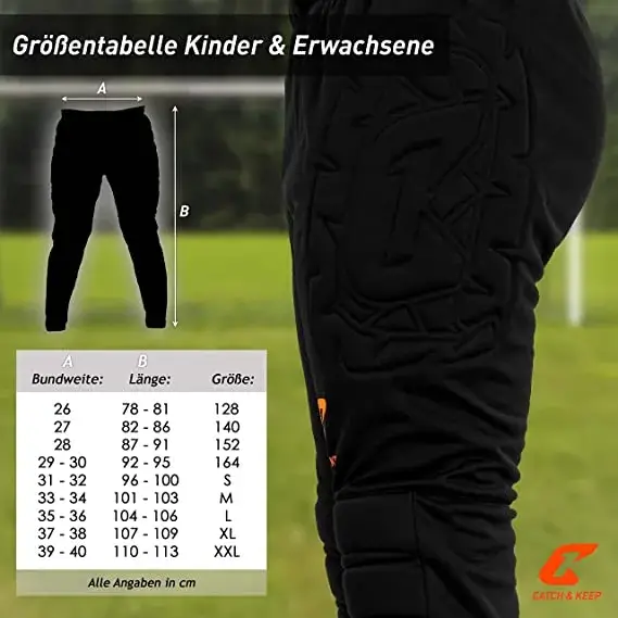 Hier findest Du die Größentabelle für unsere Catch & Keep Torwarthosen für Kinder und Erwachsene.